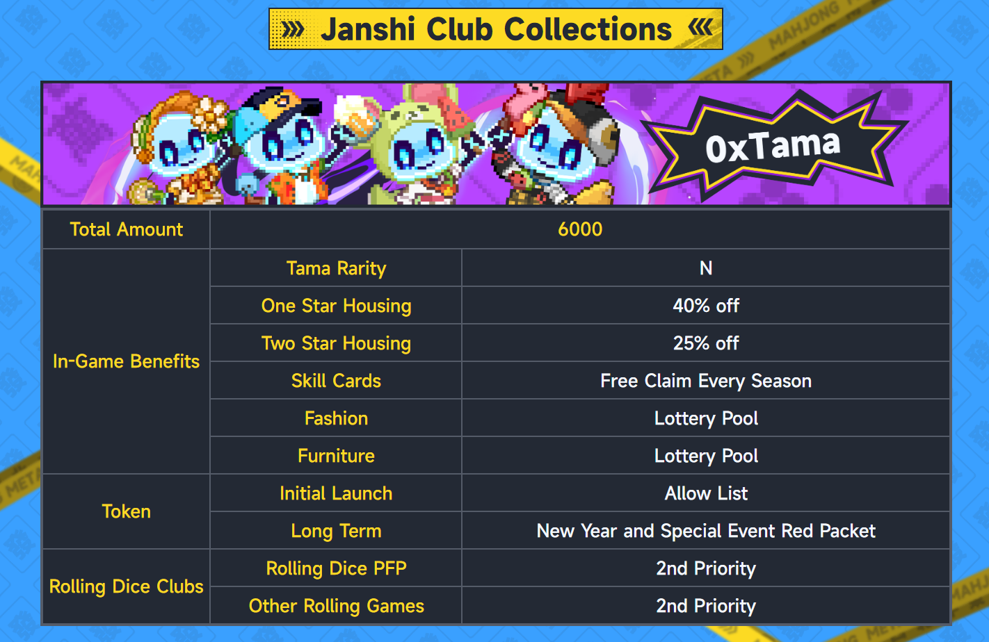 게임에서 Tama는 Mahjong Meta 플레이어가 자동화된 전략적 마작 전투에 참여할 수 있는 충성적인 애완동물 NFT 역할을 하고,