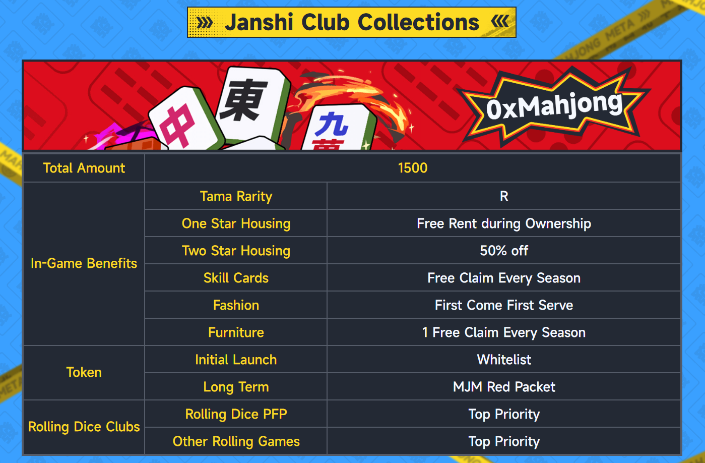 0xMahjong NFT는 총 1,500개이며 화이트리스트 Free Mint 모드를 통해 공개 발행됩니다.