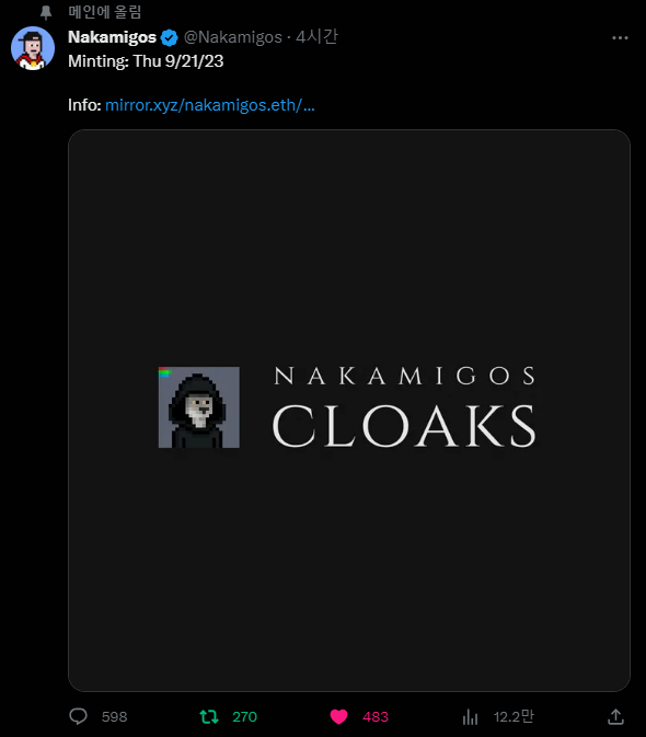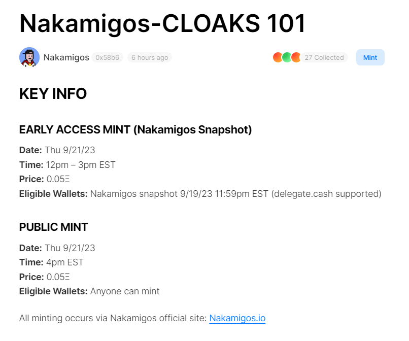 #얼리액세스 민트 (기존 나카미고스 홀더) - 총 발행량 : 20,000 - 민팅일자 : 23.09.21 - 한국시간으로 하면 22일 새벽 2시일 듯.. - 민팅가 : 0.05 ETH - *나카미고스 홀더 스냅샷은 23.09.19 11:59 EST 까지 (대충 20일 새벽 1시 59분)