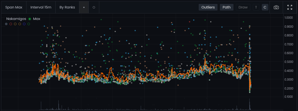 공식 트위터의 민트 발표 직후 나카미고스의 가격은 큰 폭으로 하락하였는데, (0.34 -> 0.22)